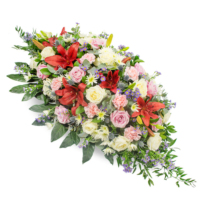 Express your condolences with our graceful casket spray, featuring a vibrant assortment of roses, lilies, and chrysanthemums. The arrangement is thoughtfully designed with fresh greenery, offering a unique and beautiful tribute.